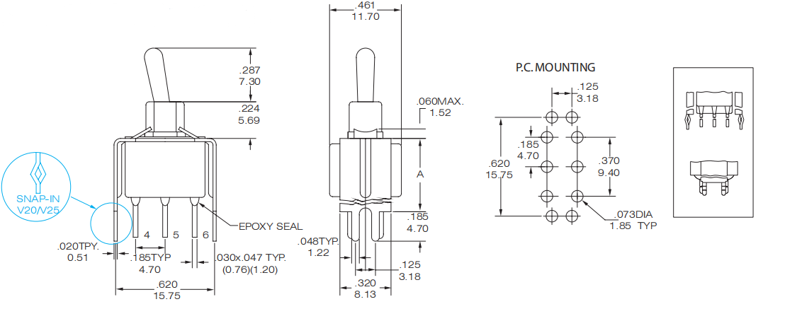 Contact Rating: 6A@125VAC or 28 VDC; 0.4VA max@ 20VAC OR DC max.